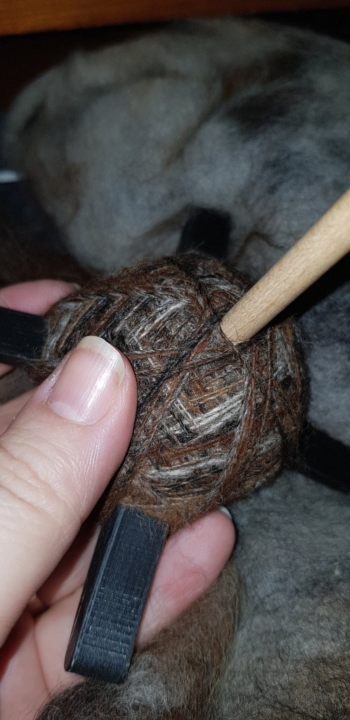 I am thinking of using all the alpaca – grey, brown, and this one, and make a couple of shawls for me and mum out of them – they all see to want to spin to a similar sort of thickness, so…………