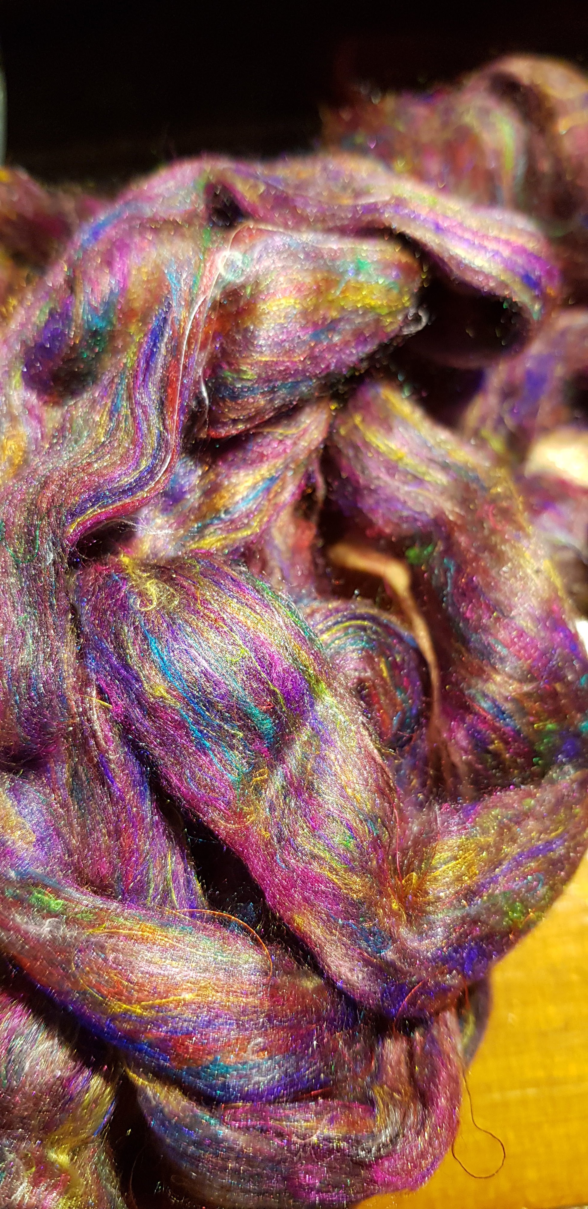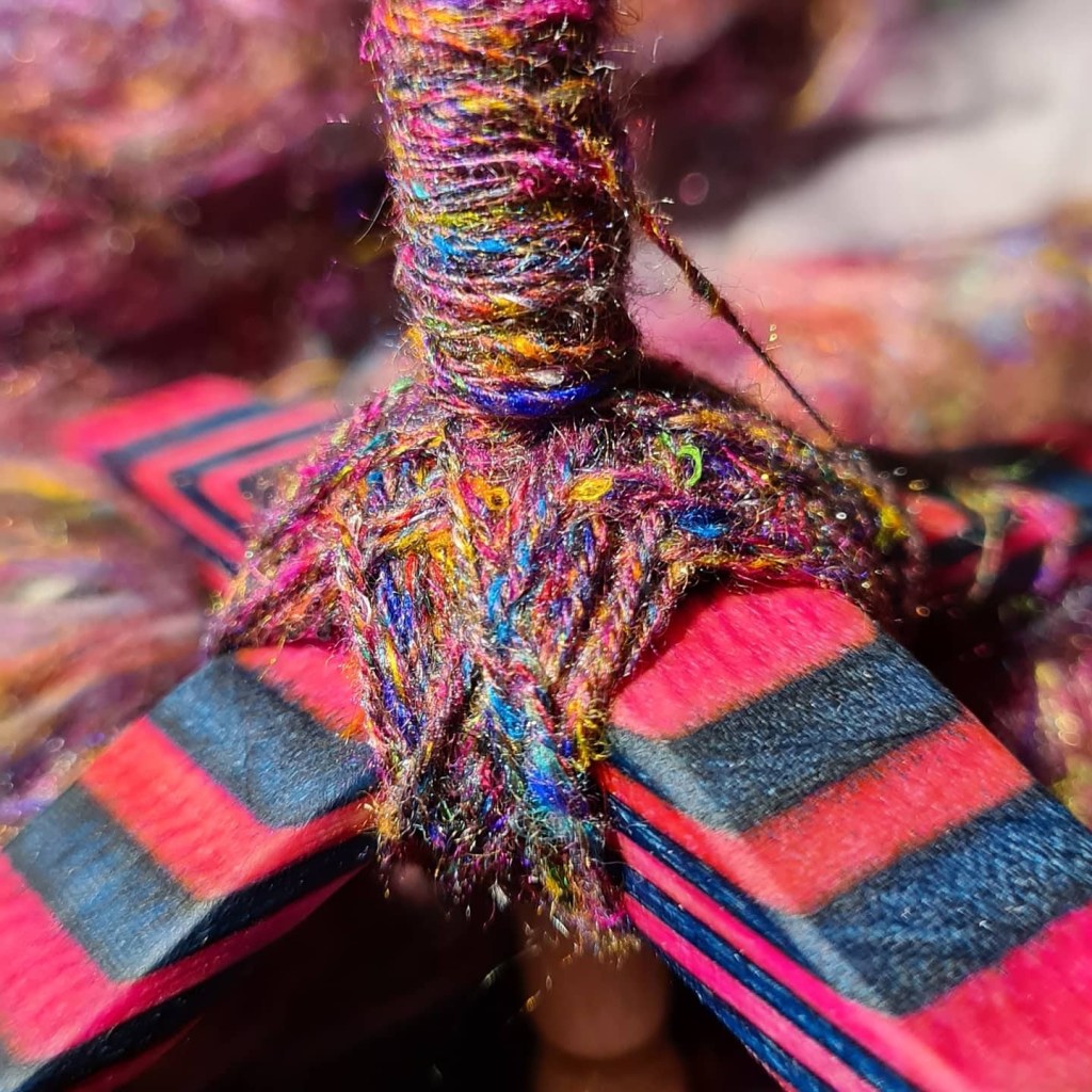 18 Holi 8/4/2019 Lovely multi-colour sari silk roving, with an overall ‘pink’ colour. Very interesting to draft, but sooo soft. Using my spindle. Started doing ply on the fly. Share this: Click to share on X (Opens in new window) X Click to share on Facebook (Opens in new window) Facebook Like Loading... Related