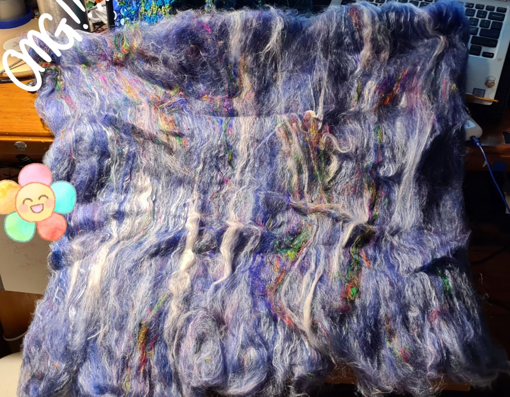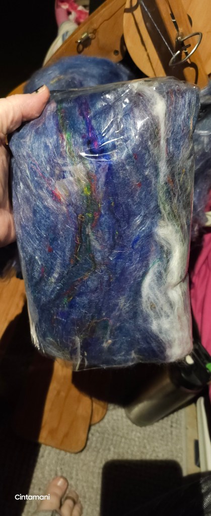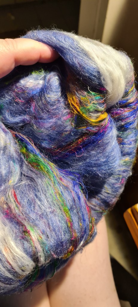 45 Spring Day 2/9/2023 – 24/12/2023 Ixchel Silky Batt ‘Storm’ 4 x 100g blues + rainbow sari silk Merino (19m) 60%, Mulberry Silk 34%, Angora bunny 6% Joy 2 – largest whorltrying to spin ‘thick’ – aiming for 4ply for thicker Lovely, soft and fluffy! Share this: Click to share on X (Opens in new window) X Click to share on Facebook (Opens in new window) Facebook Like Loading... Related